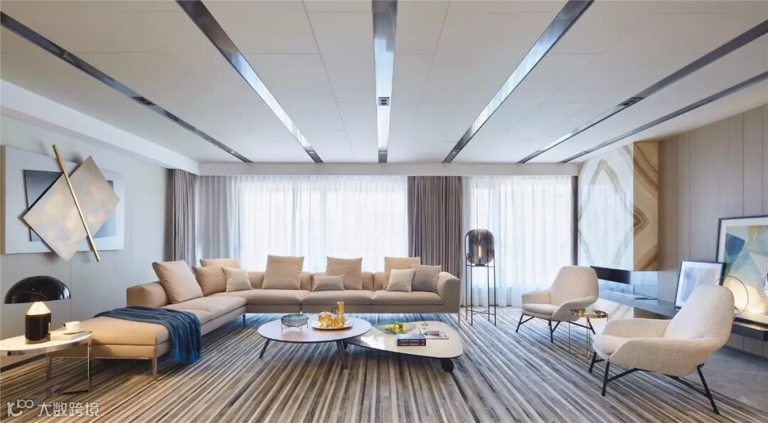 客厅作为整个空间的枢纽区域,其动线贯穿玄关、餐厅、厨房,形成一种开敞、流动之美。金属元素分割的吊顶与地毯相呼应,形成强烈的视觉张力。大面积的落地窗搭配简洁的沙发,彰显出轻松、优雅的姿态。