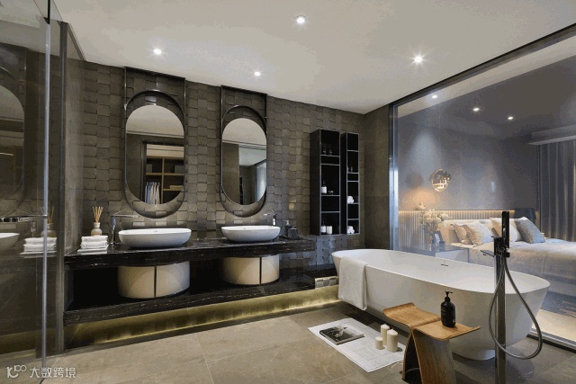 设计师将自然粗犷的质感移植到主卫,墙面的石材似鳞片状交错铺陈,在悬吊镜面与金属架的结合下,兼具功能与亮点。