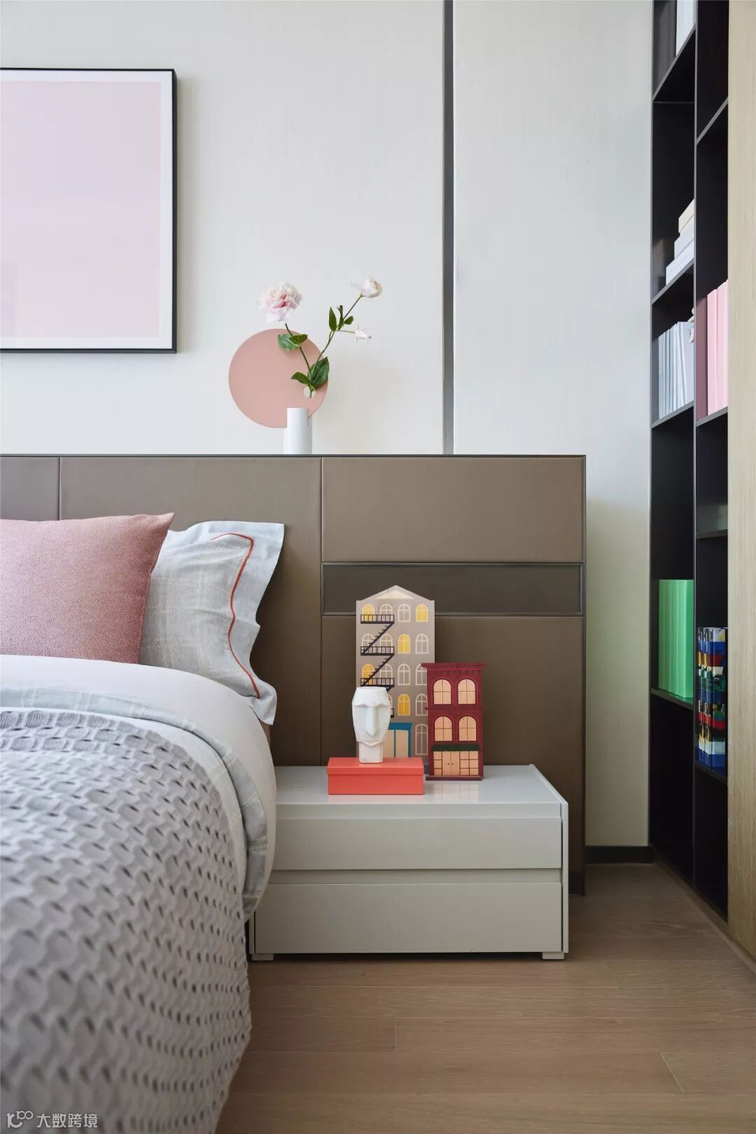 女孩房床品、背板和墙面都采用柔和的莫兰迪色系,氤氲出柔情与细腻,在日光的晕染下更加温婉可人。女儿房卫生间内圆润的曲线在多重镜面映射下,宛如梦幻之境。