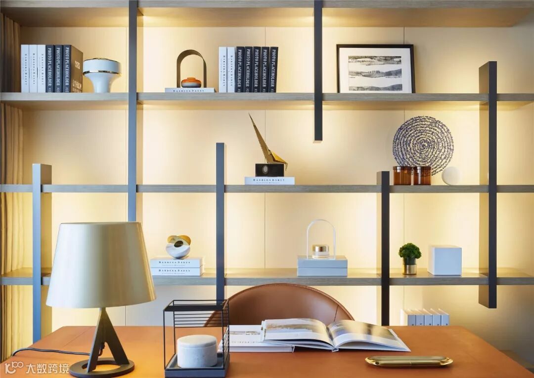 书房与主卧以移动暗门划分,门一侧墙面另内嵌水吧区域,实用与美观兼备。经典款蛋椅塑造灵动一隅,满足小憩需求。拥有立体丰富的线条与光影结构的书架,为整个空间的视觉焦点。