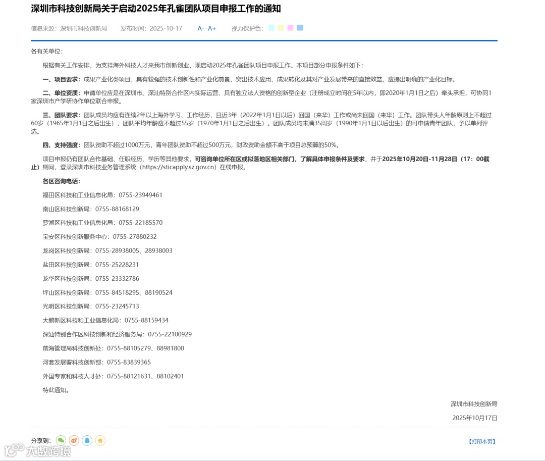 项目申报仍有团队合作基础、任职经历、学历等其他要求,可咨询单位所在区或拟落地区相关部门,了解具体申报条件及要求,并于2025年10月20日-11月28日(17:00截止)期间,登录深圳市科技业务管理系统(https://sticapply.sz.gov.cn)在线申报。