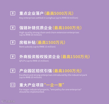 重点企业落户最高5000万元;房租补贴最高1500万元;外商投资股权投资企业最高奖励1500万元;强链补链优质企业最高1000万元;产业园区招优引强最高1000万元。