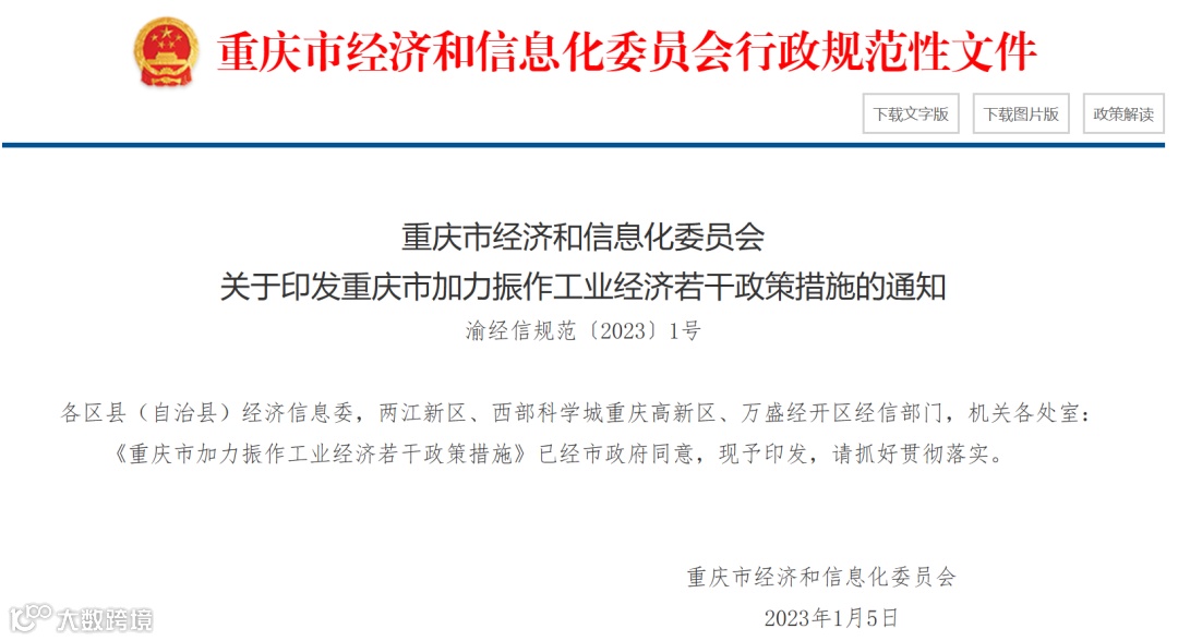 重庆:《重庆市加力振作工业经济若干政策措施》