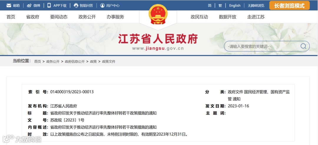 江苏:《关于推动经济运行率先整体好转的若干政策措施》