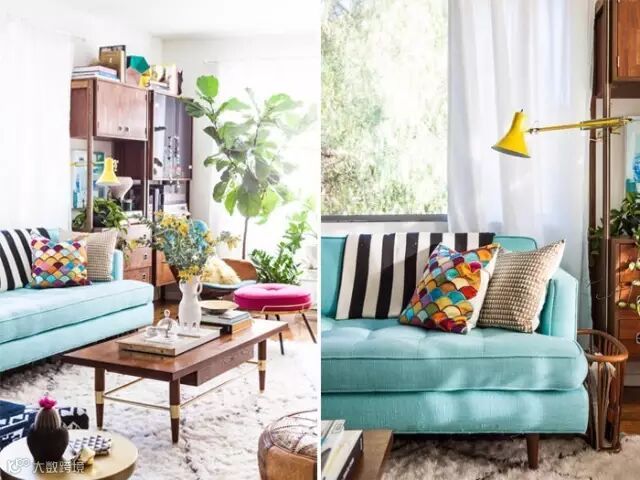 湖蓝色沙发,明黄色地灯,枚红色圆凳......这些配色明亮的家具不仅实现了冷暖色调的自如过渡,也让人仿佛一下子置身于五彩斑斓的大自然中。