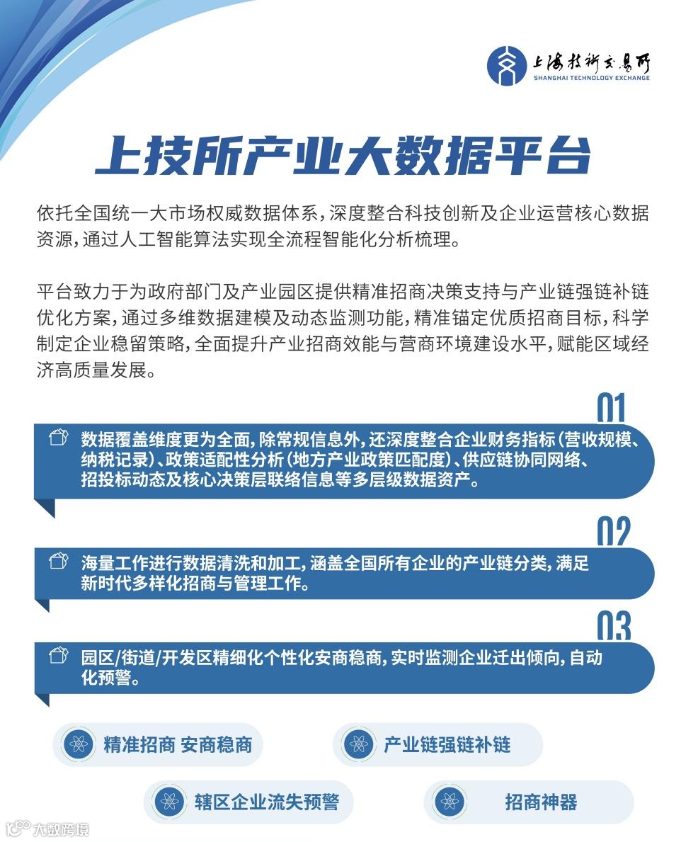 升级招商范式:依托上技所产业大数据平台的AI招商模型(如1800家企业精准触达、垂直领域产业链聚焦),赋能区域招商从“广撒网”转向“靶向突破”。