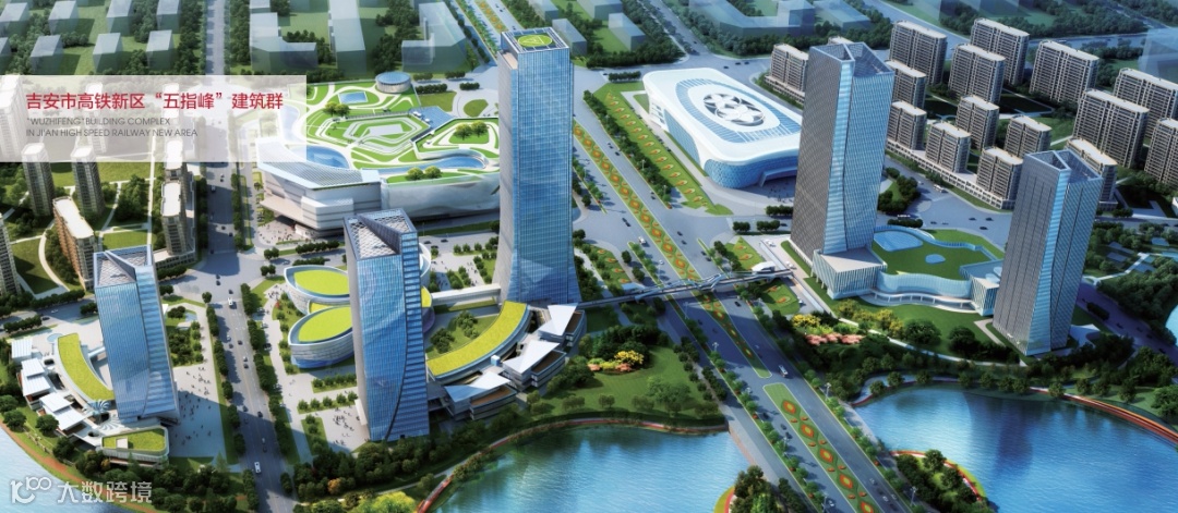 核心区“五指峰”建筑群建筑按照井冈山五指峰主题进行创作设计,规划设计为五栋建筑单体(包括科创中心、星级酒店、总部经济大厦、2栋人才公寓),打造吉安的城市门户和会客厅。“五指峰”建筑群总用地面积 152182m²,建筑面积为 439889m²。项目于2019年6月开工建设,2022年建成运营。建成后将成为我市高铁新区的城市客厅和地标建筑,并着力打造赣中地区最具影响力的电子信息研发中心、数字经济孵化中心、高端人才集聚中心和企业总部集聚中心。