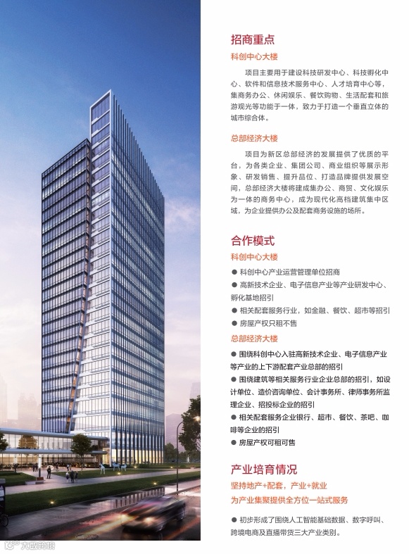 总部经济商务区:主要包括总部配套和新型材料产业园区以及数字经济和创新产业园区。总部配套及新型材料产业园区主要包括商务办公、新型材料研发、新型材料技能培训、新型材料检测、行政服务中心、新型材料展示中心、材料交易、商业配套等项目。数字经济及创新产业园主要包括数字企业研发中心、人才交流培训中心、文化创意中心、科技创新中心、展示中心、生活配套(公寓)、商业配套等项目。