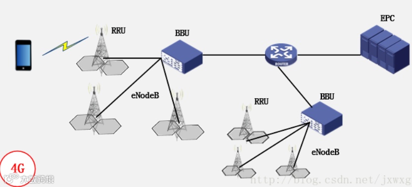 4G采用了扁平化的网络架构。将原来的3级网络架构“扁平化”为2级,RNC的功能一部分分割在eNodeB中,一部分移至核心网中,每个BBU可以连接10-100个RRU,进一步降低网络的部署周期和成本。
