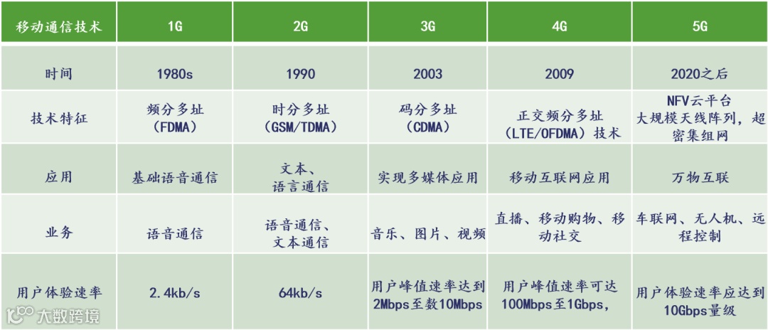 5G关键能力之一是能为大规模移动用户提供在热点区域1Gbps的数据的传输速率。而据IMT-2020数据显示,5G比4G具备更高的性能,体现在用户体验速率、流量密度、时延、移动性和峰值速率上。而对于3G、4G等前代通信技术而言,通信速率是唯一的作为判断技术能力的指标。