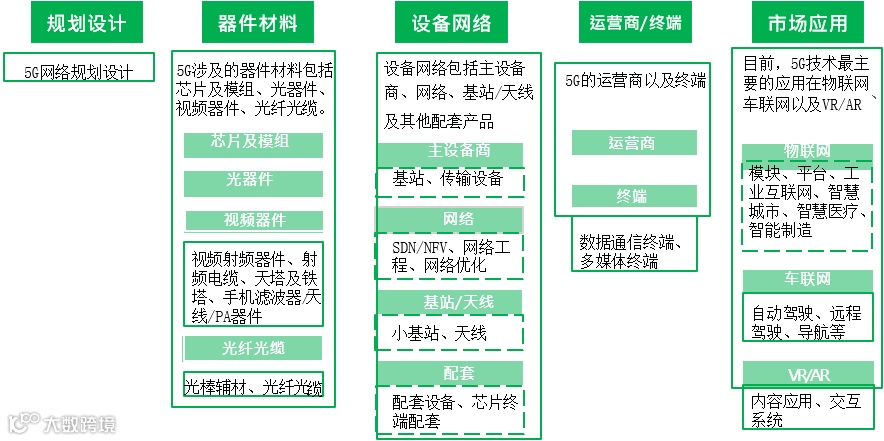 5G通信产业主要集中在四个层面,即基站系统、网络架构、终端以及应用等。
