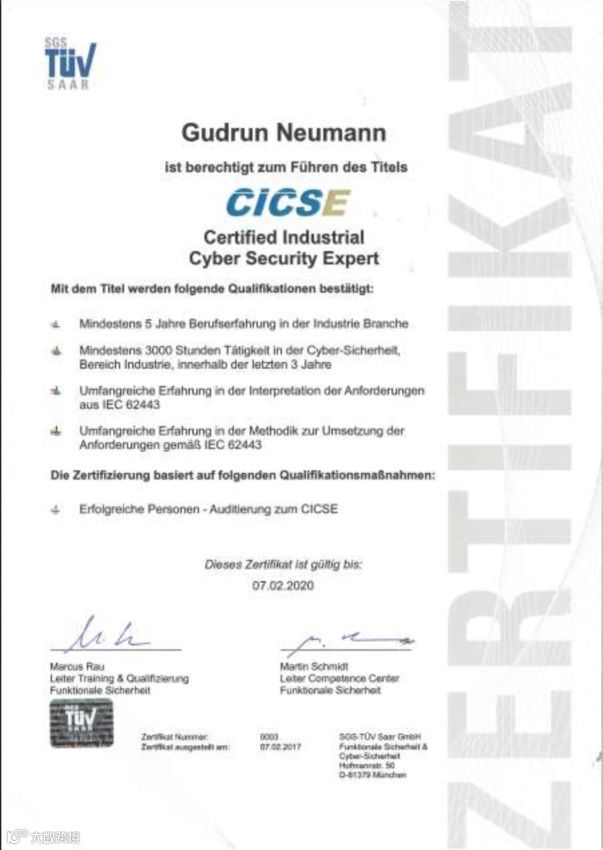 学员成功完成本课程第一部分内容学习后即可参加考试,并考试通过后获得由SGS-TUV SAAR颁发的ACICSP工业网络安全高级工程师证书.