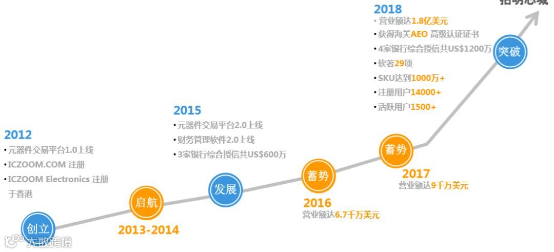 2015年12月 拍明芯城(Iczoom)正式备案上线,平台实现了用户批量发布买盘、卖盘,系统自动匹配价格,一键下单模式,并实时和供应链平台数据同步,高效精准的为买方、卖方完成货物流、资金流、票据流服务。