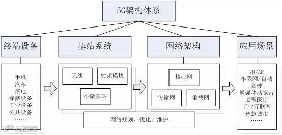 我们将5G架构体系划分为基站系统、网络结构、应用场景和终端设备四个部分,每部分都对应各自不同的产业链环节。