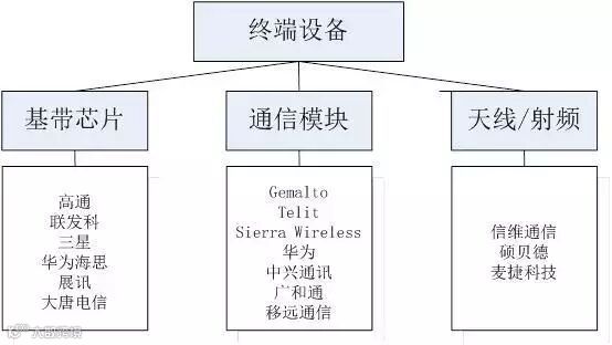 终端设备:5G 的终端设备将不局限于手机和电脑,还将涵盖家电、汽车、穿戴设备、工业设备等,其核心产业链环节为通信芯片、通信模块、天线和射频等部分。