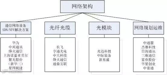 由于SDN/NFV 的应用,涉及核心网、传输网、承载网等架构将实行重构,其产业链环节主要包括通信网络设备及 SDN/NFV 解决方案、光纤光缆、光模块、网络规划优化和运维。
