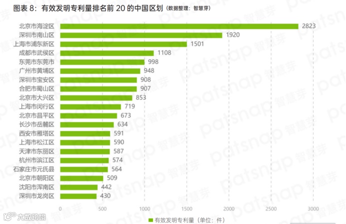 在“专精特新”小巨人企业专利能力的区域分布上,如果将颗粒度进一步细分到区,可以看到有效发明专利量排名前20的分别是,北京市海淀区、深圳市南山区、上海市浦东新区、成都市武侯区、广东省东莞市、广州市黄埔区、深圳市宝安区、合肥市蜀山区、北京市大兴区和上海市闵行区;11-20名的区域则有北京市昌平区、长沙市岳麓区、西安市雁塔区、上海市松江区、天津市东丽区、杭州市滨江区、石家庄市元氏县和北京市朝阳区。