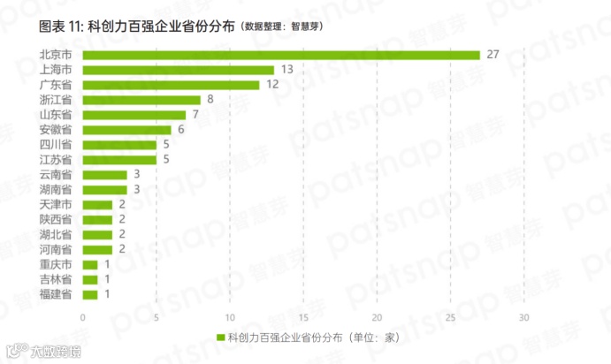 《报告》显示,科创力排名前100企业的省份分布中,排名前三的省份分别为北京市、上海市和广东省,分别有27家、13家和12家企业上榜。而浙江省、山东省、安徽省和江苏省分别有 8、7、6、5 家企业上榜。