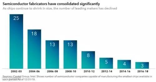 2003年,全球共有25家逻辑芯片制造商。如今,在一系列并购和及时的退出后,美国巨头英特尔,韩国三星和台湾半导体公司主导了逻辑芯片制造领域。