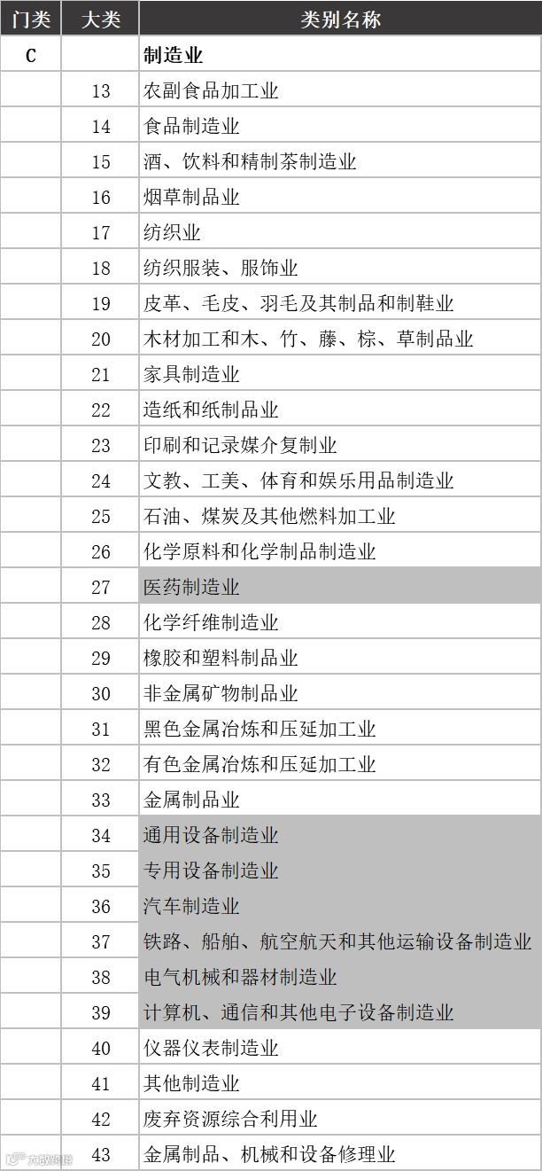 在我国国民经济分类中,制造业被划分为C类,大类编号区间从13到43,具体如下图: