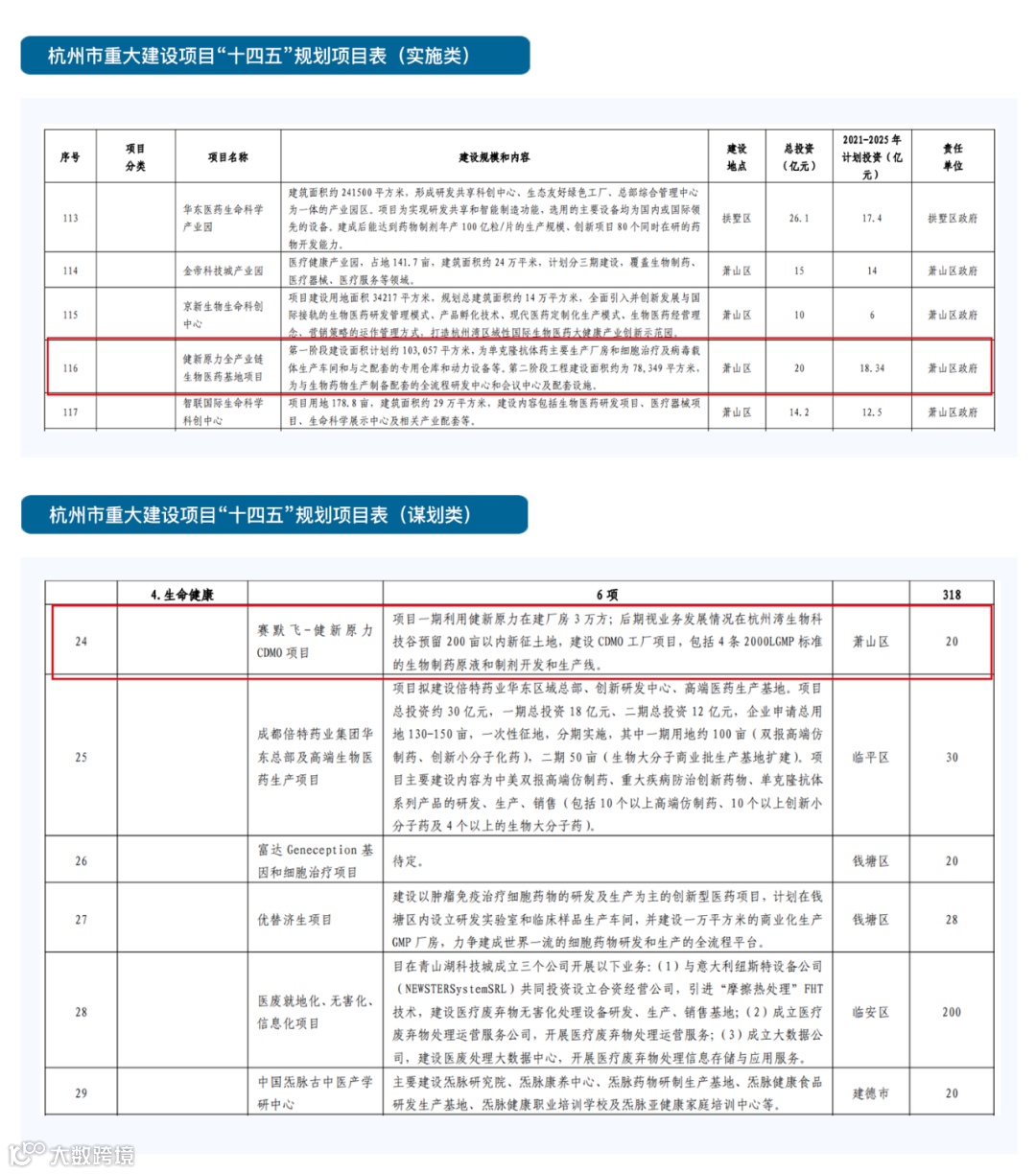 近日,杭州市发改委发布《杭州市重大建设项目“十四五”规划项目表》。“健新原力全产业链生物医药基地项目”入选,健新原力也是唯一一家入选的细胞与基因治疗以及RNA的CDMO公司。