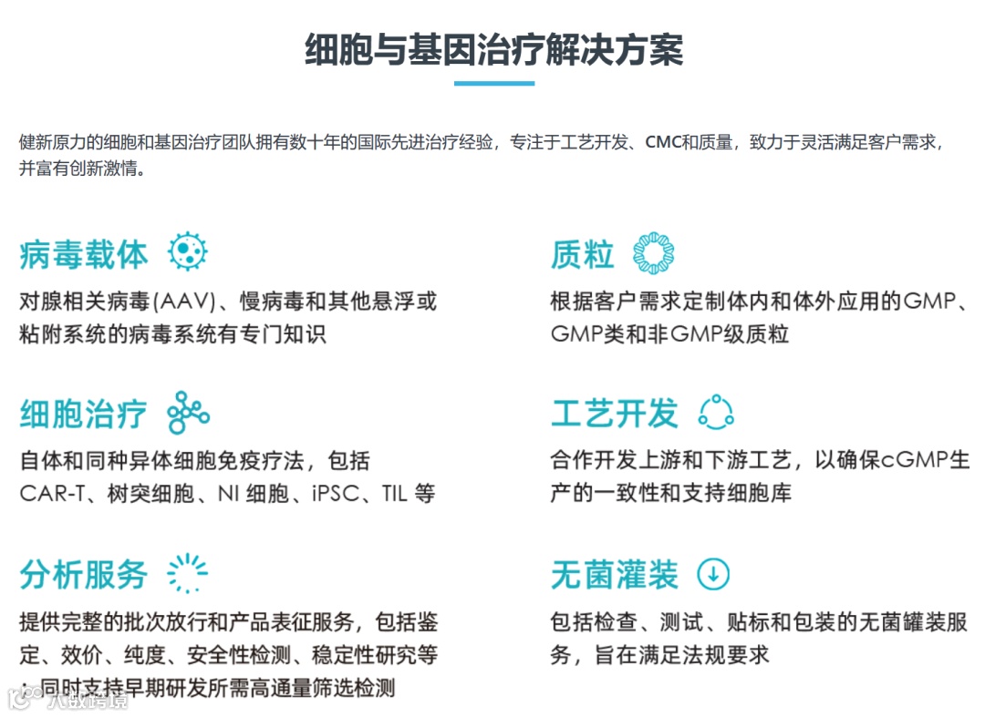 健新原力提供端到端的合同开发与制造服务(CDMO),其中包括质粒 DNA、RNA、病毒载体和细胞治疗产品的 GMP 商业化生产。此外,健新原力还通过与一家领先的国际生命科学产品与服务的供应商成立的合资企业,提供抗体和蛋白质药物 CDMO 服务。公司还拥有在孵化和开发细胞治疗、基因治疗等先进生物疗法方面的能力,能够支持合作伙伴和投资组合公司更高效地推出影响全球患者生活的尖端疗法。