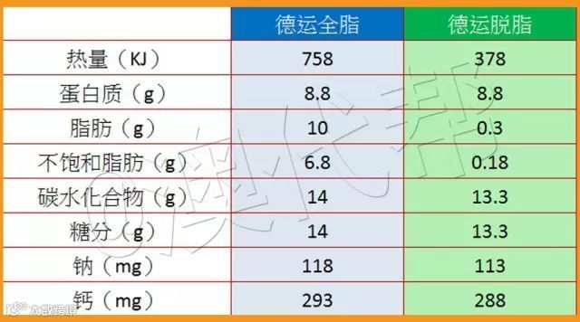 1. 德运脱脂奶粉的热量、脂肪含量都远远低于全脂奶粉;