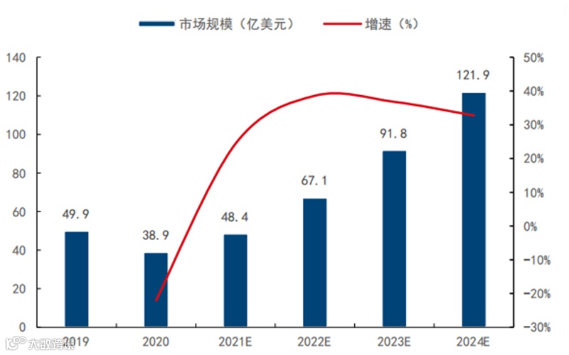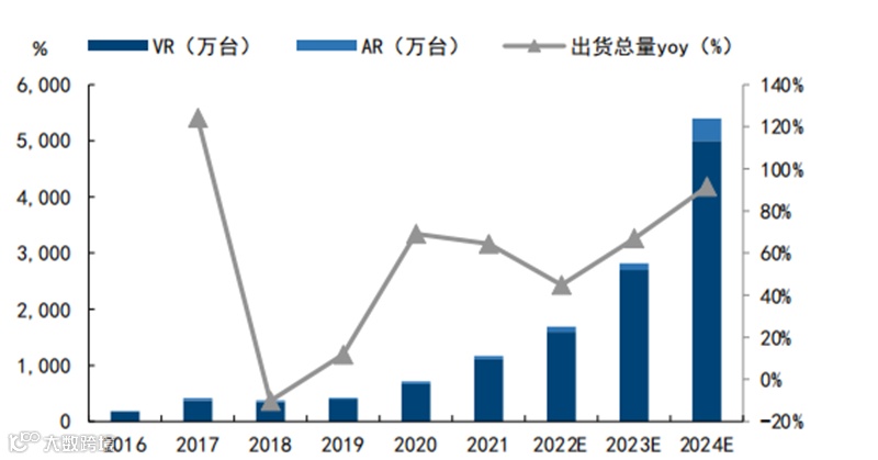 ▲2016-2024E年全球VR/AR头显出货量变化及预测