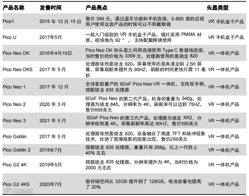 ▲Pico历代产品设备梳理