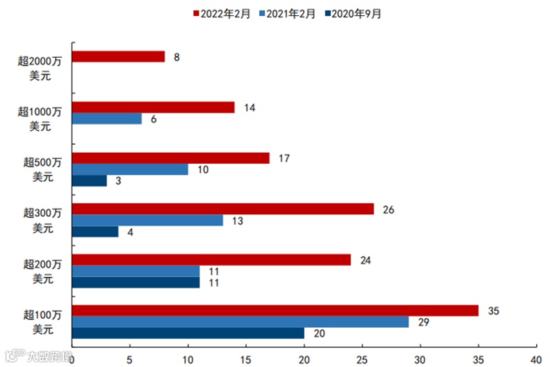 ▲2020年9月、2021年2月和2022年2月Quest Store发布应用内容收入规模分布