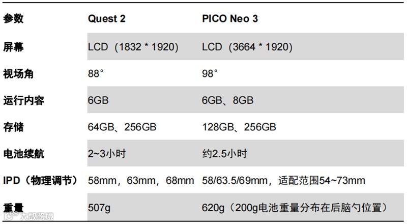 ▲Pico Neo3和Quest 2硬件参数对比