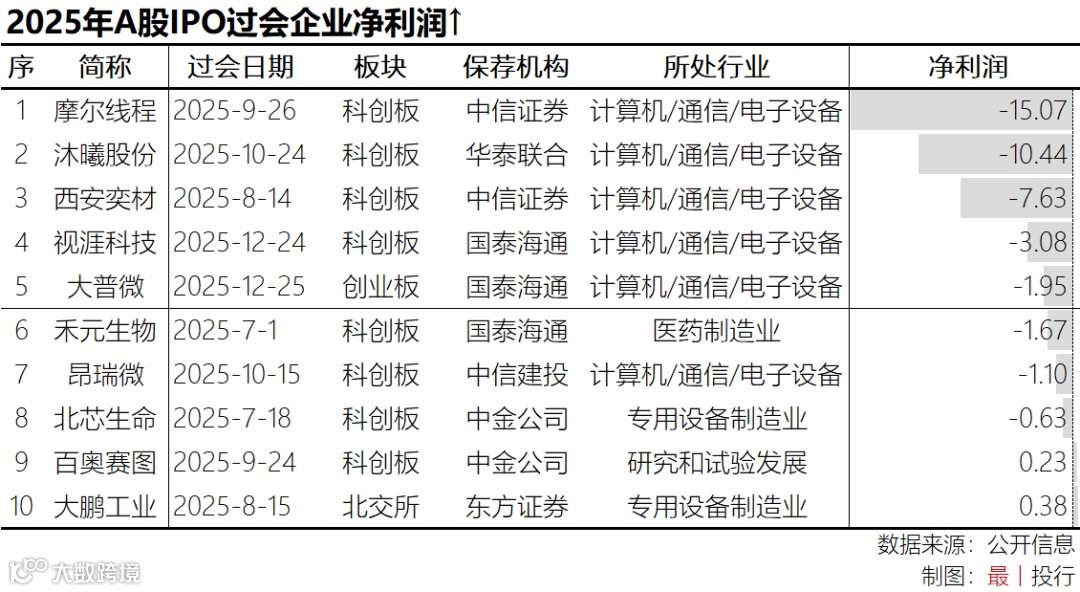 2025年过会企业中最近一年亏损金额最大的为中信证券保荐的“国产GPU第一股”摩尔线程(科创板),2024年度扣非后归母净利润-15.07亿元