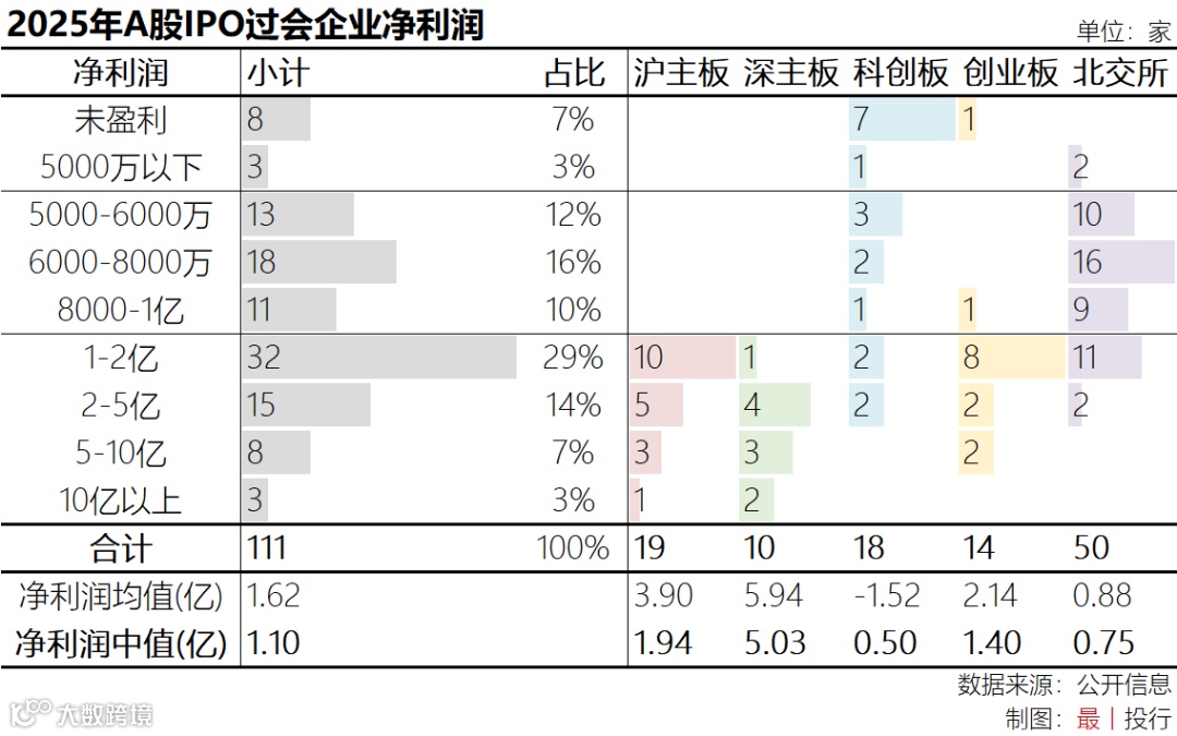 111家过会企业最近一年扣非后归母净利润(以下简称“净利润”)平均值为1.62亿元,中位数为1.10亿元