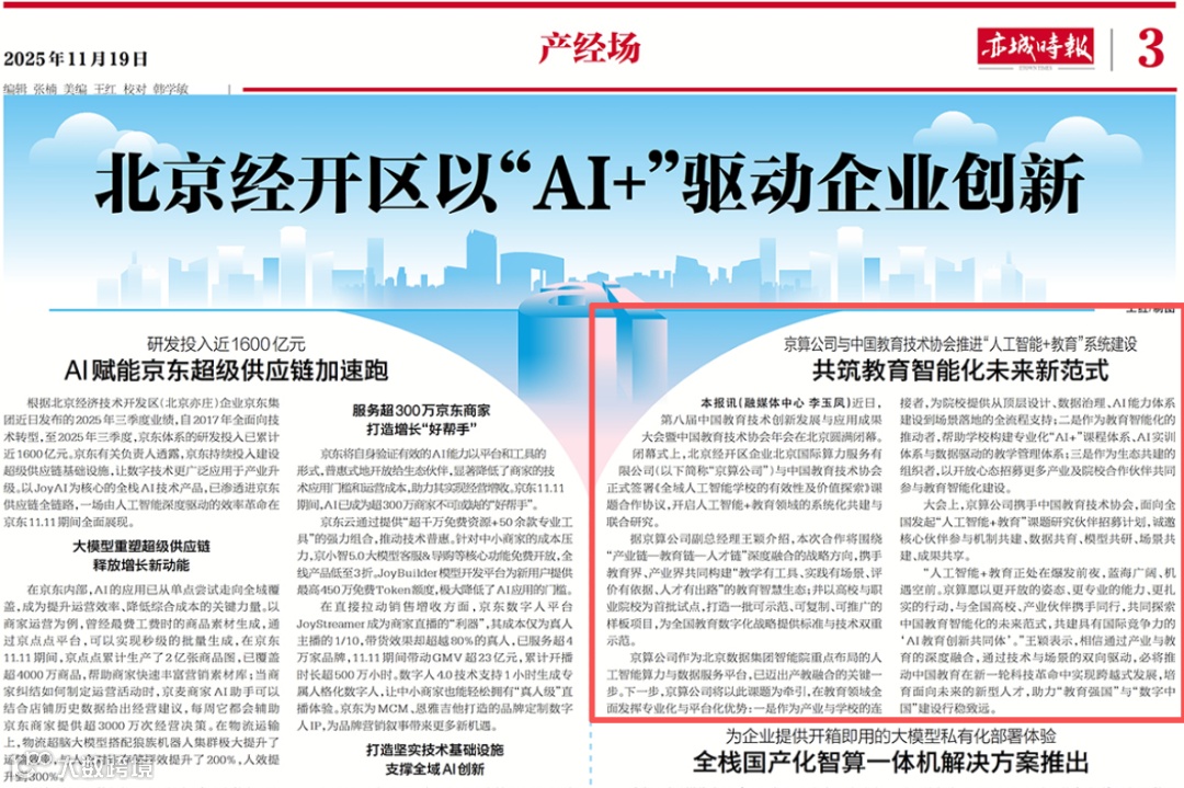 11月19日,《亦城时报》第3版报道了智能院旗下京算公司与中国教育技术协会签署《全域人工智能学校的有效性及价值探索》课题合作协议,共筑教育智能化未来新范式。