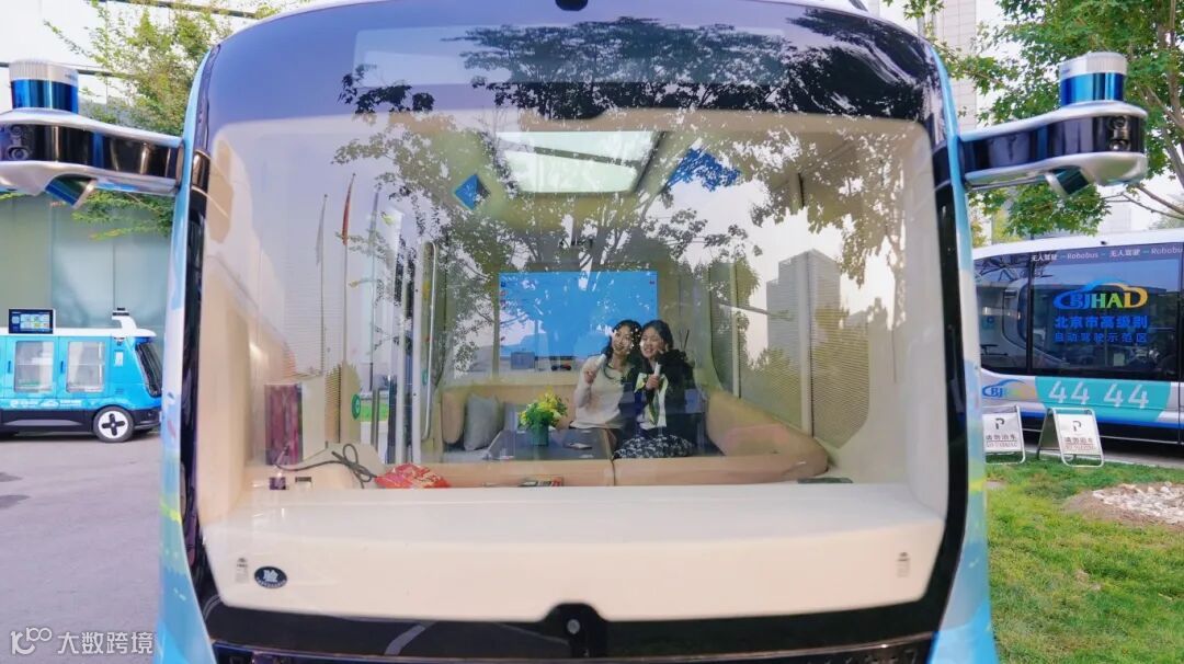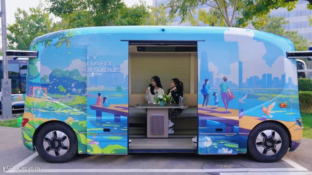 走近这辆多巴胺蓝色车身的自动驾驶小巴,只见它两侧顶着雷达摄像头,造型充满未来感。打开中间的滑动门,一个宛如小房间的车内空间展现在眼前,车内沙发三面环绕,中间的桌子还内嵌一个迷你冰箱,车载数字人“忆琪”的声音也随即响起,可以全程通过语音交互提供引导、报站等服务。和朋友上车落座,随着车辆平稳起步,自动驾驶小巴缓缓汇入城市的车流中。