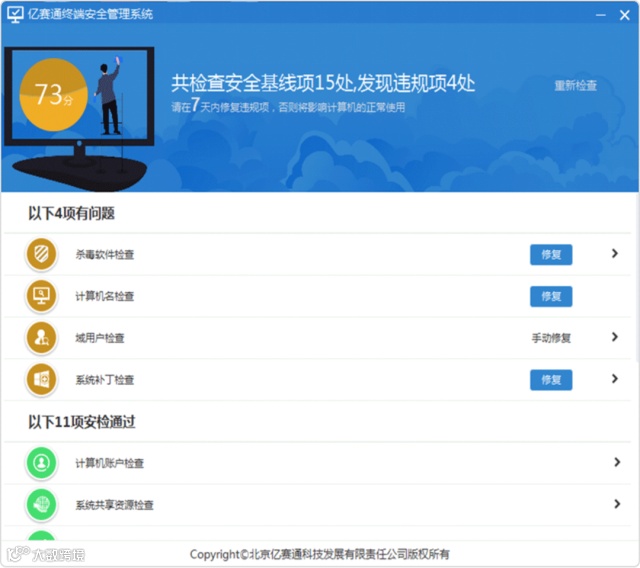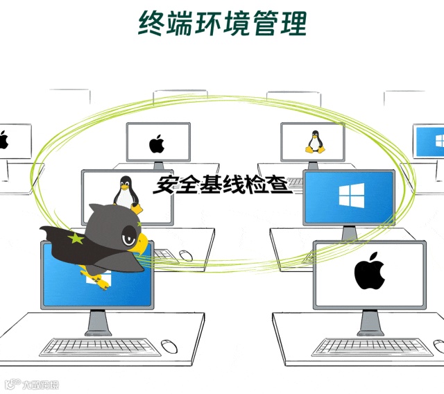 通过全周期的风险评估,持续动态地优化终端安全基线,操作系统、杀软、注册表、补丁、核心服务、系统共享等,一键检查,自动修复。
