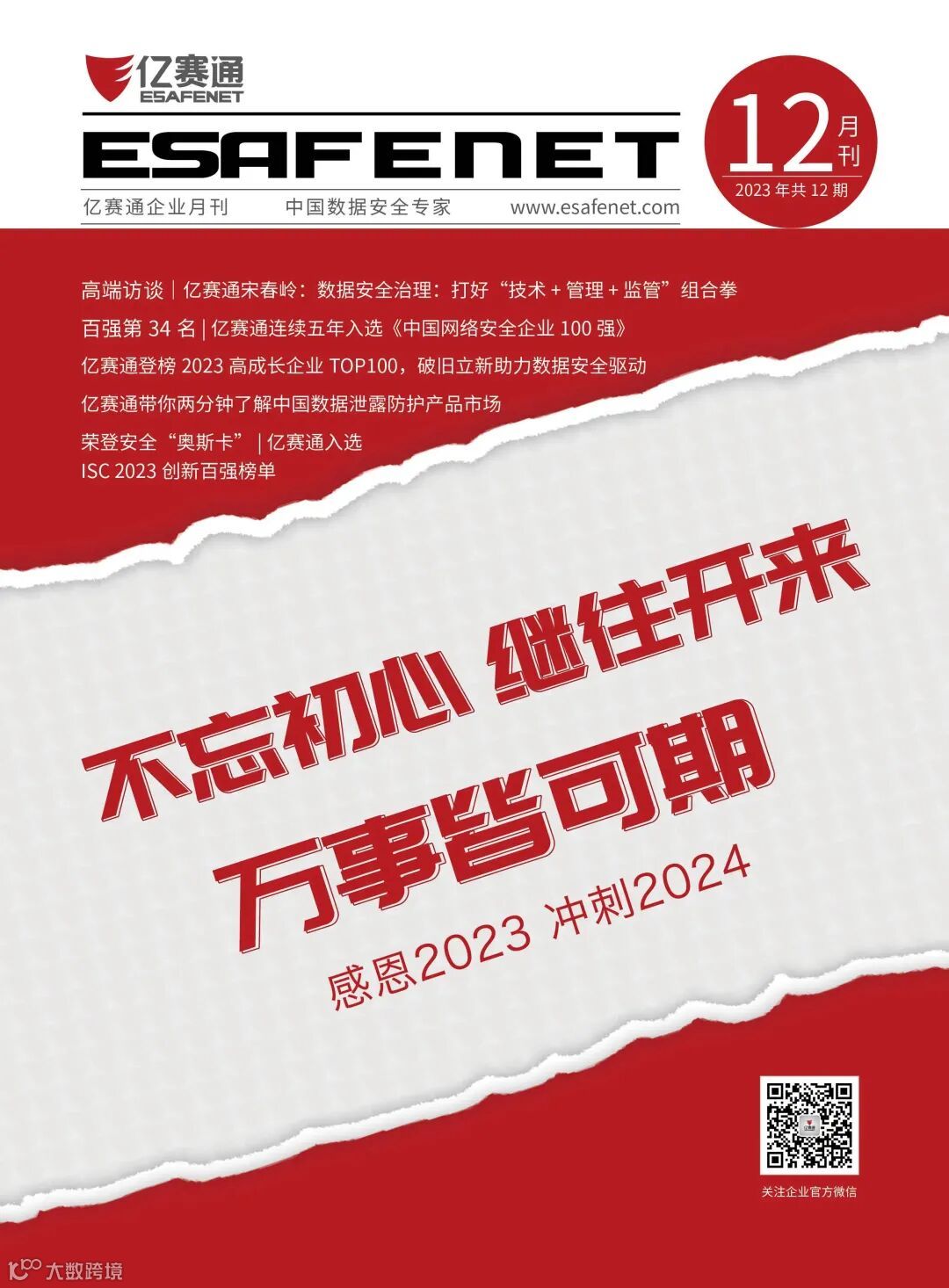 当前,数字经济浪潮席卷全球,信息化、数字化、网络化和智能化正在快速覆盖我们的生活、工作中。数据安全产业已成为数字经济发展的前提和保障基石,在国家新兴产业战略中的重要地位得到充分肯定。近年来的一系列政策和配套措施如雨后春笋般发布、实施,数据安全产业的发展春天已经来临。亿赛通在政策的扶持下大力加强技术研发、产品创新、服务升级,2024年定会获得新的机会和增长点,后续凭借大幅扩增的客户需求顺势而进,承接安全产业红利,助推客户数字化进程。值此新春佳节之际,亿赛通全体员工祝大家新年快乐!