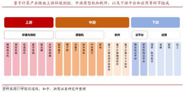 量子计算产业链可分为上游、中游和下游三个核心环节,各环节技术特点: