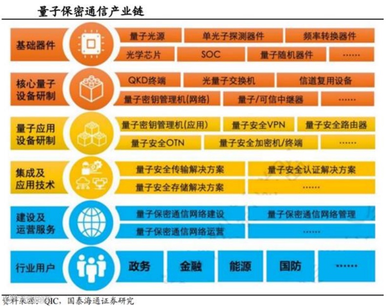 国内QKD产业发展。经过多年的技术积累和项目实践,我国已经形成了以QKD技术为核心的较为完整的量子保密通信产业链。自上而下分为基础器件、核心量子设备研制、量子应用设备研制、集成及应用技术、建设及运营服务、行业用户六个部分。其中,基础器件包括量子光源、单光子探测器件、频率转换器件、光学调制器件、电子学调制器件、量子随机数发生器等关键器件;核心设备包括QKD 终端、光量子交换机、信道复用设备、量子密钥管理机、可信中继器、量子中继器等等;量子应用设备包括量子安全VPN、量子安全路由器、量子安全OTN、量子安全加密机等:集成及应用技术包括量子安全传输、量子安全认证、量子安全存储等解决方案:建设及运营服务包括量子保密通信网络建设、量子保密通信网络管理、量子保密通信网络运营等方面;行业用户涵盖国防、金融、政务、能源、电网等等。