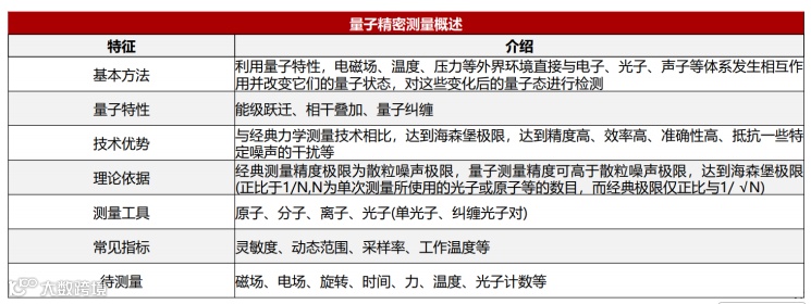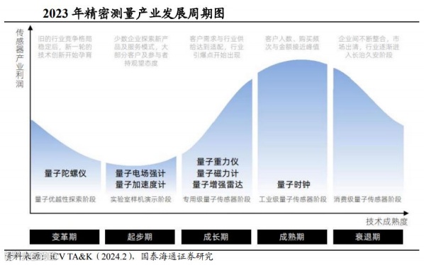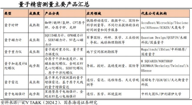 量子精密测量主要是利用量子状态对环境的高度敏感,提升对时间、位置、加速度、电磁场等物理量的测量精度,涉及的方向和领域相对较多,具有应用场景丰富、产业化前景明确等优势。但由于不同物理量的量子传感器成熟度存在差异,产业进入多元化发展周期。