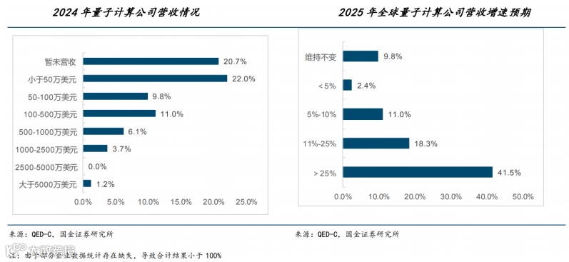 预计2025年约六成量子计算企业营收将显著提升。根据QED-C统计,全球513家量子计算企业中,2024年营收突破1000万美元的企业占4.9%,而收入不足50万美元的企业比例高达42.7%。反映出行业发展初期存在的显著分化现象。技术储备雄厚、资金实力突出且掌握市场渠道的企业竞争优势显著。随着量子硬件应用范围的持续扩展以及政府资金投入的逐步加大,预计2025年将有59.8%的量子计算公司实现10%以上的收入增长,行业有望快速构建起技术迭代与市场需求双向驱动的良好格局。