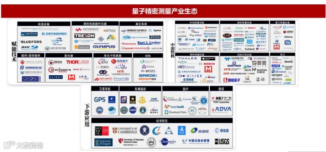量子精密测量的上游基本为美国、英国、德国、日本企业,提供可为量子系统使用的激光、低温系统、磁体环境、真空系统、电子元器件、线缆、材料(特殊金属金刚石、稀土等)等。产业链中游企业通过对上游产品集成,以及开发与产品配套的软件或系统,提供整体解决方案,产品包括原子钟、量子磁力计、冷原子干涉重力仪、陀螺仪、加速度计、原子力显微镜、电子顺磁共振波谱仪、量子雷达等。产业链下游应用场景包括卫星导航、国防军工、医疗、通信等场景。