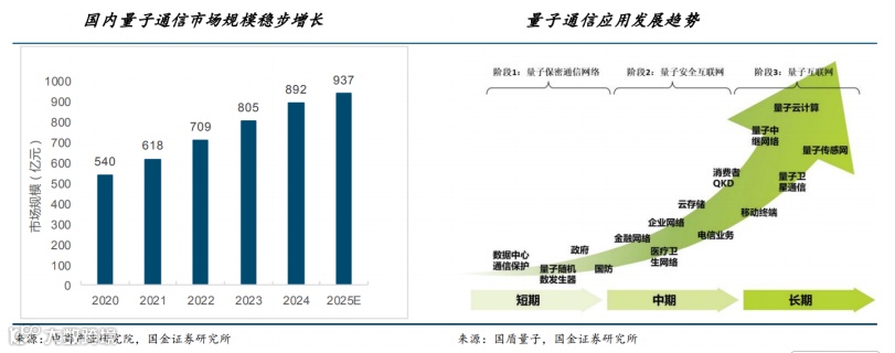 作为量子通信领域的重要分支,QKD技术有望推动全域通信安全体系持续升级。随着量子信息技术的发展,量子通信网络及其应用不断演进。目前,量子保密通信的应用主要集中在利用QKD链路加密的数据中心防护、量子随机数发生器领域,并延伸至政务、国防等特殊领域的安全应用;未来,随着 QKD 组网技术成熟,终端设备趋于小型化、移动化,QKD还将拓展到电信网、企业网、个人与家庭、云存储等更广泛的应用领域;长远来看,随着量子卫星、量子中继、量子计算、量子传感等技术取得突破,通过量子通信网络连接分布式的量子计算机和量子传感器,还将催生量子云计算、量子传感网等一系列全新应用形态,进一步打开市场增长空间。