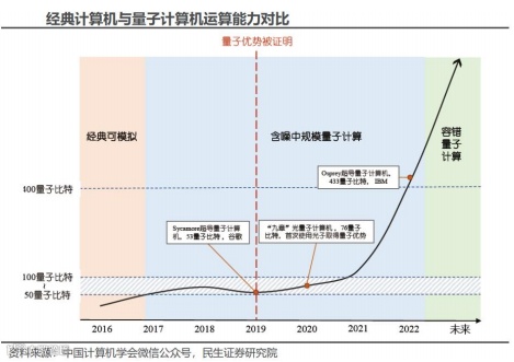 在经典计算中,计算能力与晶体管数量成正比例线性关系,而量子计算机中算力将以量子比特的指数级规模增长,据中国计算机学会微信公众号,2012年“量子优势”(同样的计算任务,量子计算速度高于传统计算)的概念被提出,并在2019年由谷歌团队实现了实验验证,2020年,潘建伟院士团队基于高斯玻色采样模型成功构建了76个光子的量子计算原型机“九章”进一步验证了量子优势。量子计算机所能拥有的量子比特数由最初的2量子比特增长到了数百量子比特,并正以可观的速度继续增长,这为实现更可靠、更大规模的量子计算,以及挖掘基于量子计算的人工智能应用带来更多可能性。