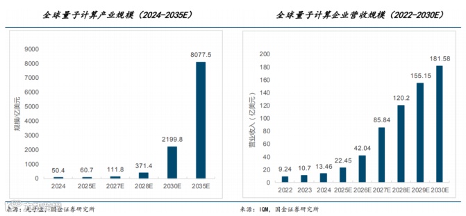 量子计算有望迎来爆发式增长,即将进入发展的黄金阶段。随着量子纠错技术的迭代优化和算法体系的不断完善,量子计算行业正从技术探索阶段快速向产业化应用过渡。从产业规模来看,根据光子盒统计,2024年全球量子计算市场规模突破50亿美元,预计2024至2030年将以87.64%的年均增长率(CAGR)保持高速增长,到2030年整体市场规模有望突破2000亿美元。从营收规模看,根据IQM统计,2024年全球量子计算企业的总营收规模达到13.46亿美元,未来5年CAGR有望达51.90%。
