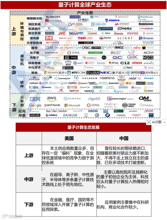 在量子计算领域,美国领先,中国位列第一梯队。美国在量子计算产业链上游稍有短板,中游与下游领先。中国在中游取得各项技术突破,但在下游应用生态方面略有逊色。