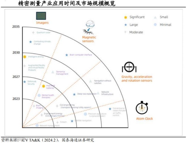ICV预计,从2023年到2035年,不同领域对于量子精密测量的需求逐渐增长,呈现出多元化的应用场景。首先,对于一些低市场规模的应用,如网络时频管理、心理健康治疗等,虽然市场规模相对较小,但量子精密测量的高精度和灵敏度为这些领域带来了更为精准的数据和解决方案,为技术的逐步商业化提供了契机。特别是在老年痴呆症治疗、气候变化对抗等领域,量子精密测量的精确诊断和数据采集能力将成为未来关键技术,推动这些领域的创新和发展。其次,随着技术的不断成熟,大规模商业化的领域也将在未来几年逐渐崛起。例如,航空交通管制雷达、无卫星导航、卫星导航等领域对于高精度测量的需求逐渐增大,量子精密测量技术将在这些领域发挥更为重要的作用。而在深海探测、电池改良、智能驾驶等领域,量子精密测量的高灵敏度和高精度将成为技术突破的助推器,为产业的不断升级提供动力。最后,2023年至2030年之间,量子雷达技术的应用也将逐渐拓展。量子雷达的高分辨率和高灵敏度使其在国防安全、环境/能源监测、航空交通管理雷达等领域具有独特优势。预计随着技术的进一步发展,量子雷达将在未来成为下一代雷达技术的重要组成部分。
