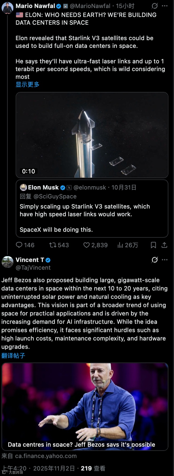 2025年秋季,就在全球AI计算需求如脱缰野马般飙升之际,太空突然成为数据中心的新战场。马斯克宣告SpaceX将借助星链卫星网络进军轨道计算,贝佐斯预言千兆瓦级设施将在10至20年内升空。这场AI计算革命从地表升至太空,不仅是两大巨头在争抢新蓝海,也可能成为破解电力短缺和环保争议的关键,甚至重塑万亿美元级云计算版图,只是这一切的技术壁垒与资金投入,足以考验任何涉足企业的雄心。