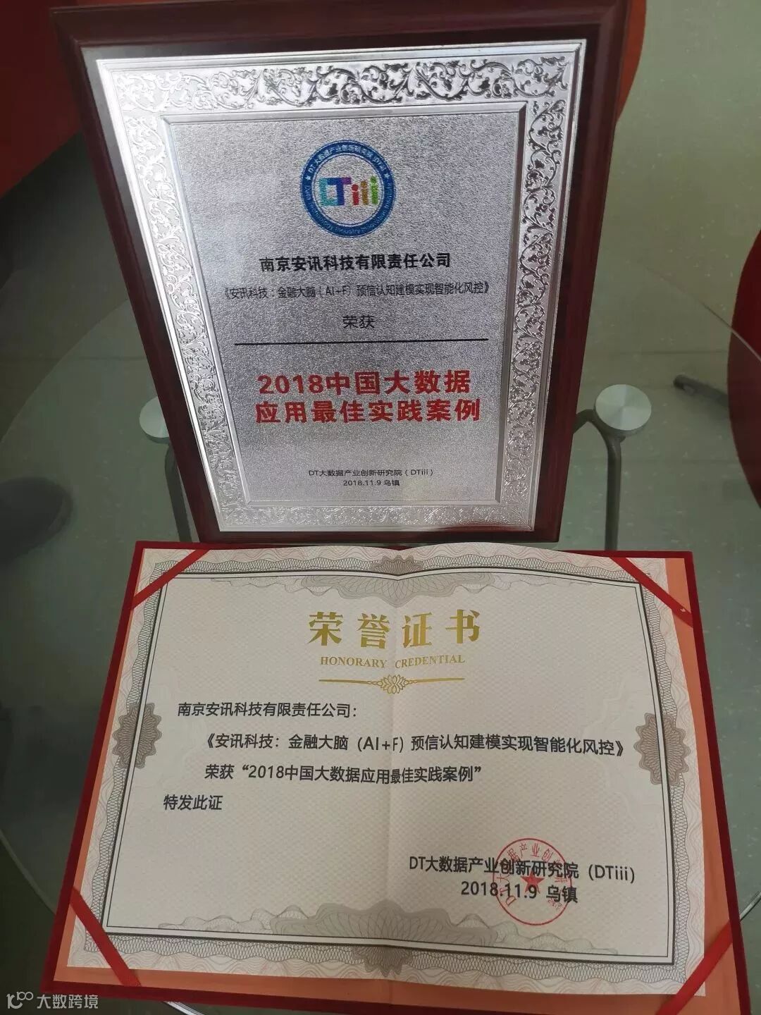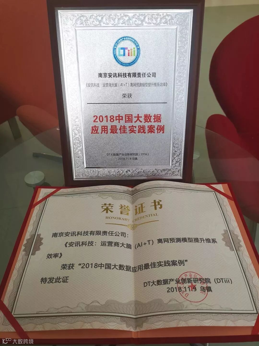 安讯科技从1311家大数据企业甄选中脱颖而出,申报的《安讯科技:金融大脑(AI+F)预信认知建模实现智能化风控案例》、《安讯科技:运营商大脑(AI+T)离网预测模型提升维系效率案例》,荣获2018中国大数据应用最佳实践案例(由DT大数据产业创新研究院发布)。