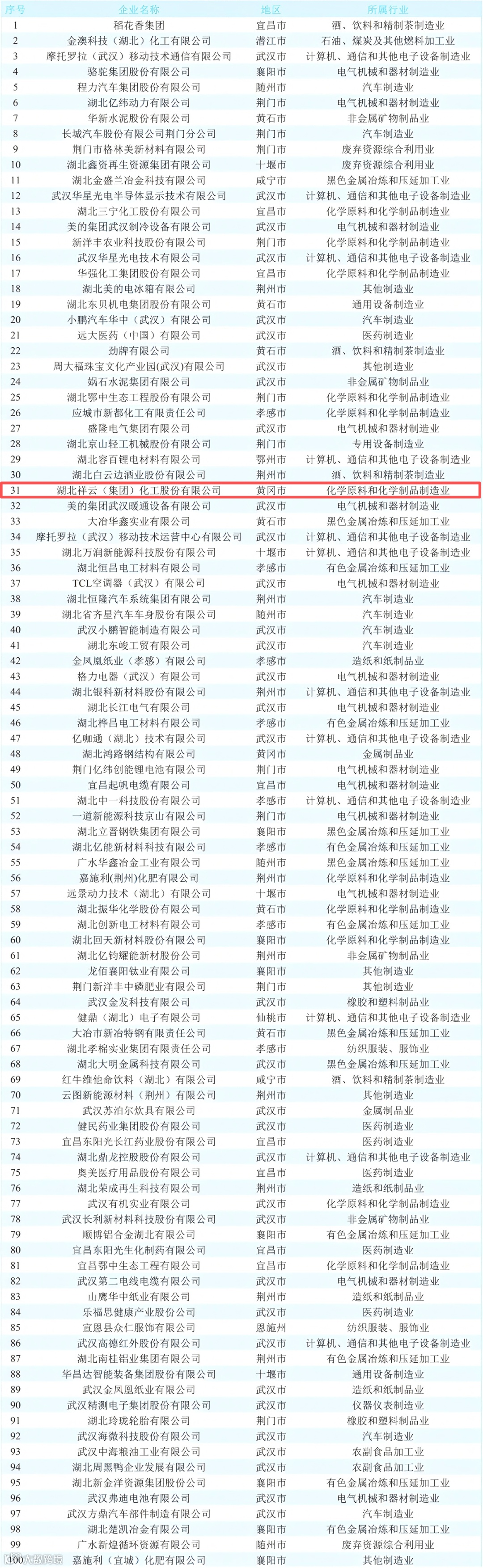 湖北祥云(集团)化工股份有限公司荣获2025湖北省民营企业100强 (第51位,比去年上升3位) 、湖北民营企业制造业100强 (第31位,比去年上升1位)荣誉称号,成为武穴市唯一一家上榜企业。据了解,2025湖北民营企业100强入围门槛为40.3亿元。自2011年开始,祥云股份已连续15年上榜湖北民企“双百强”榜单。
